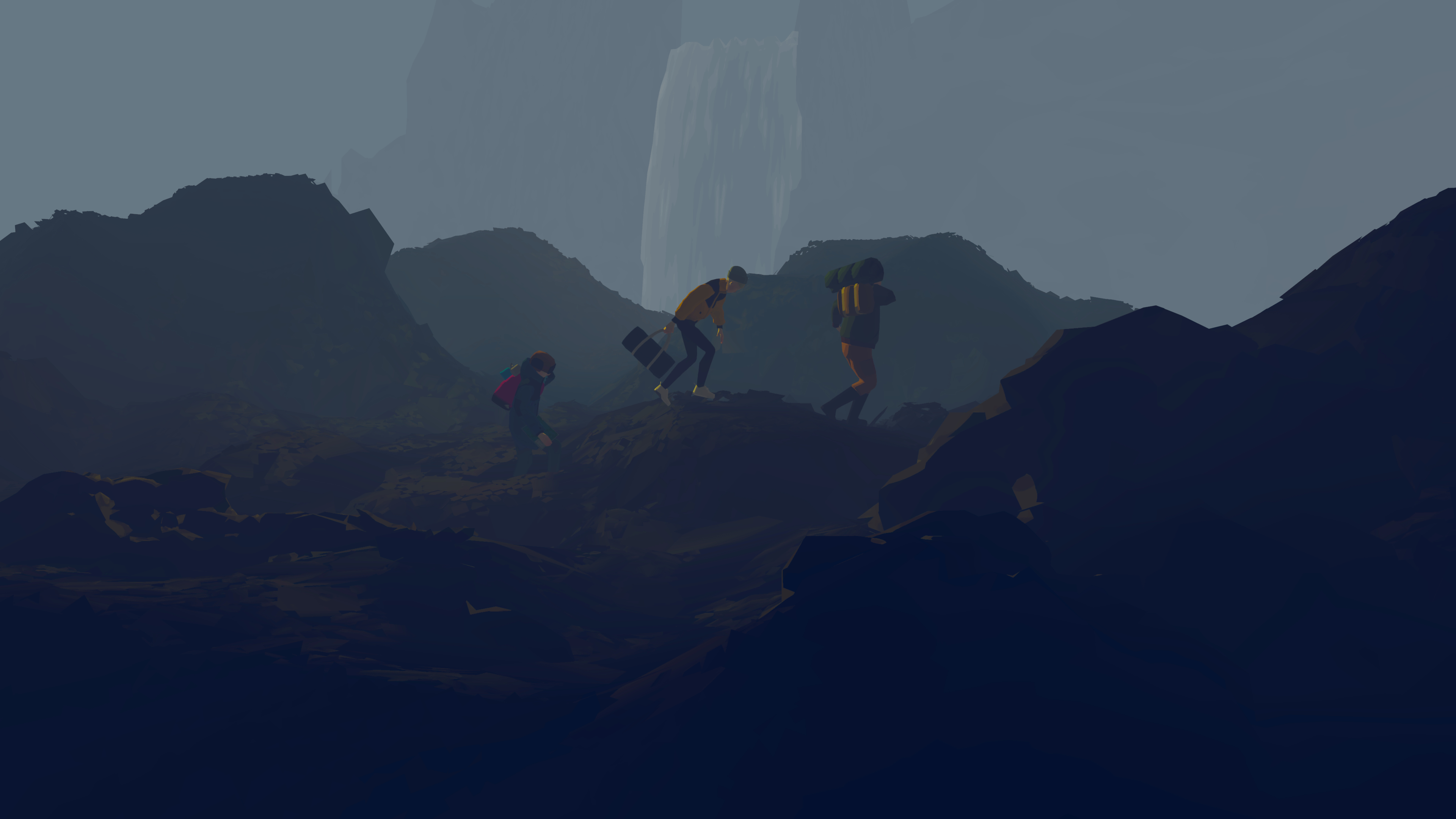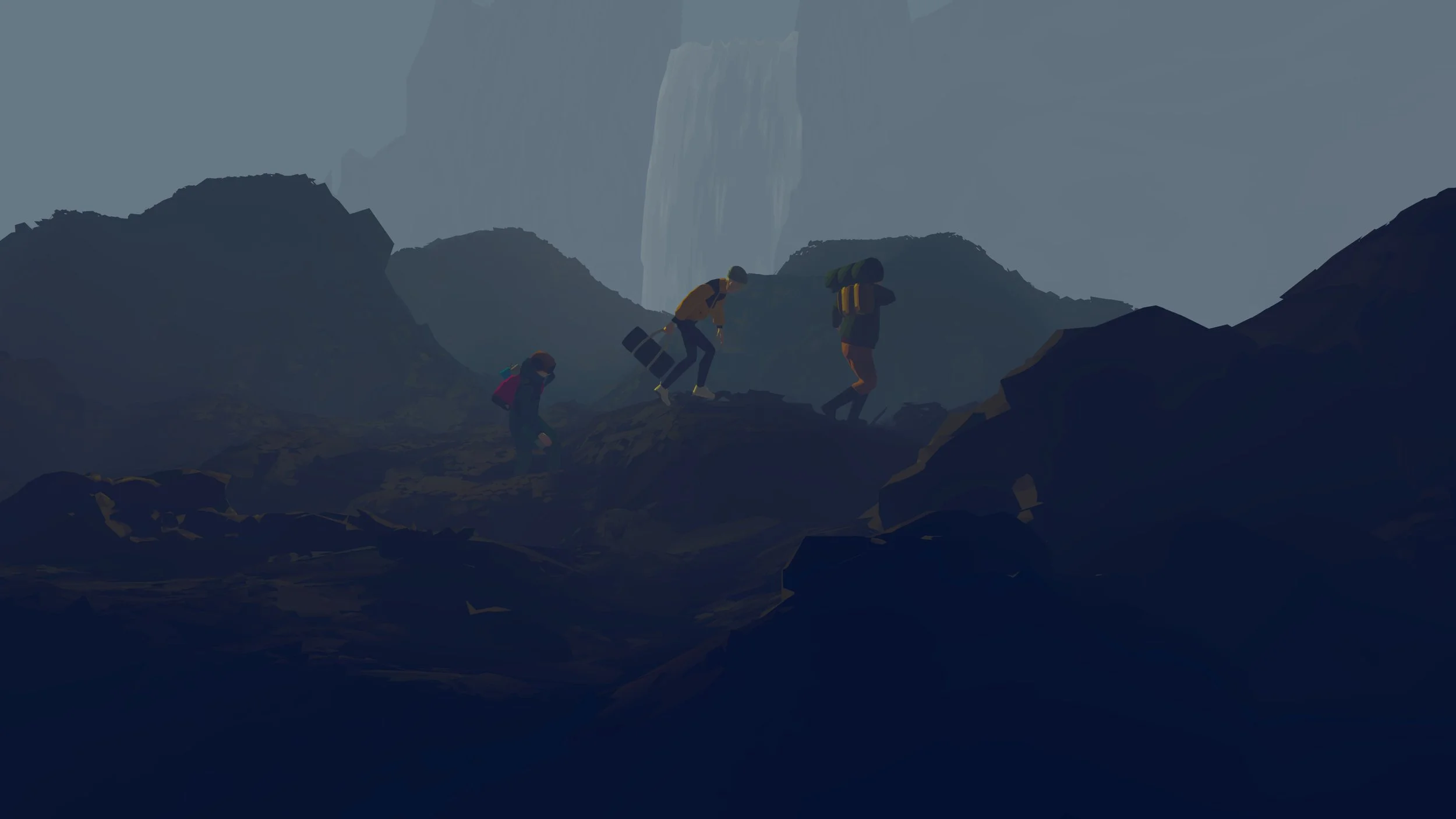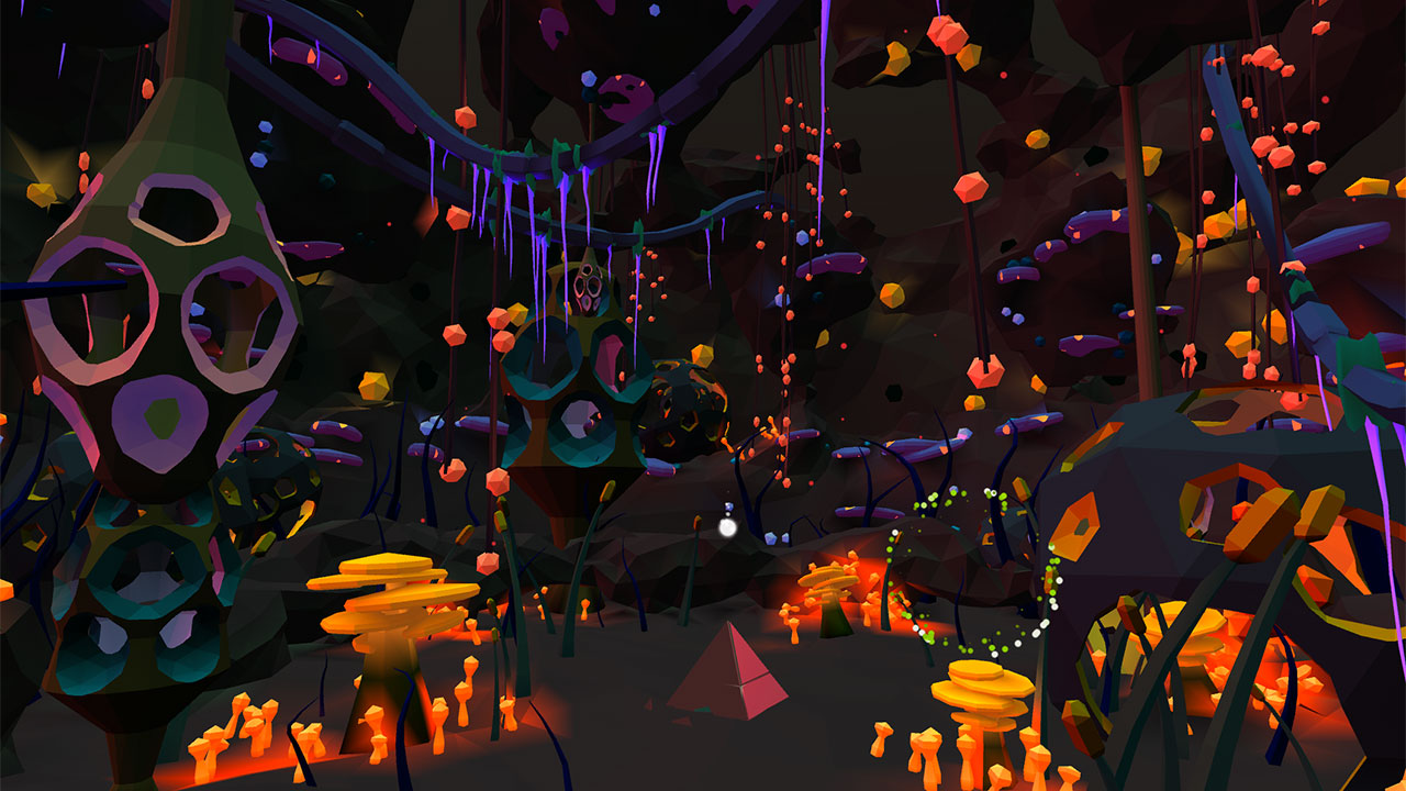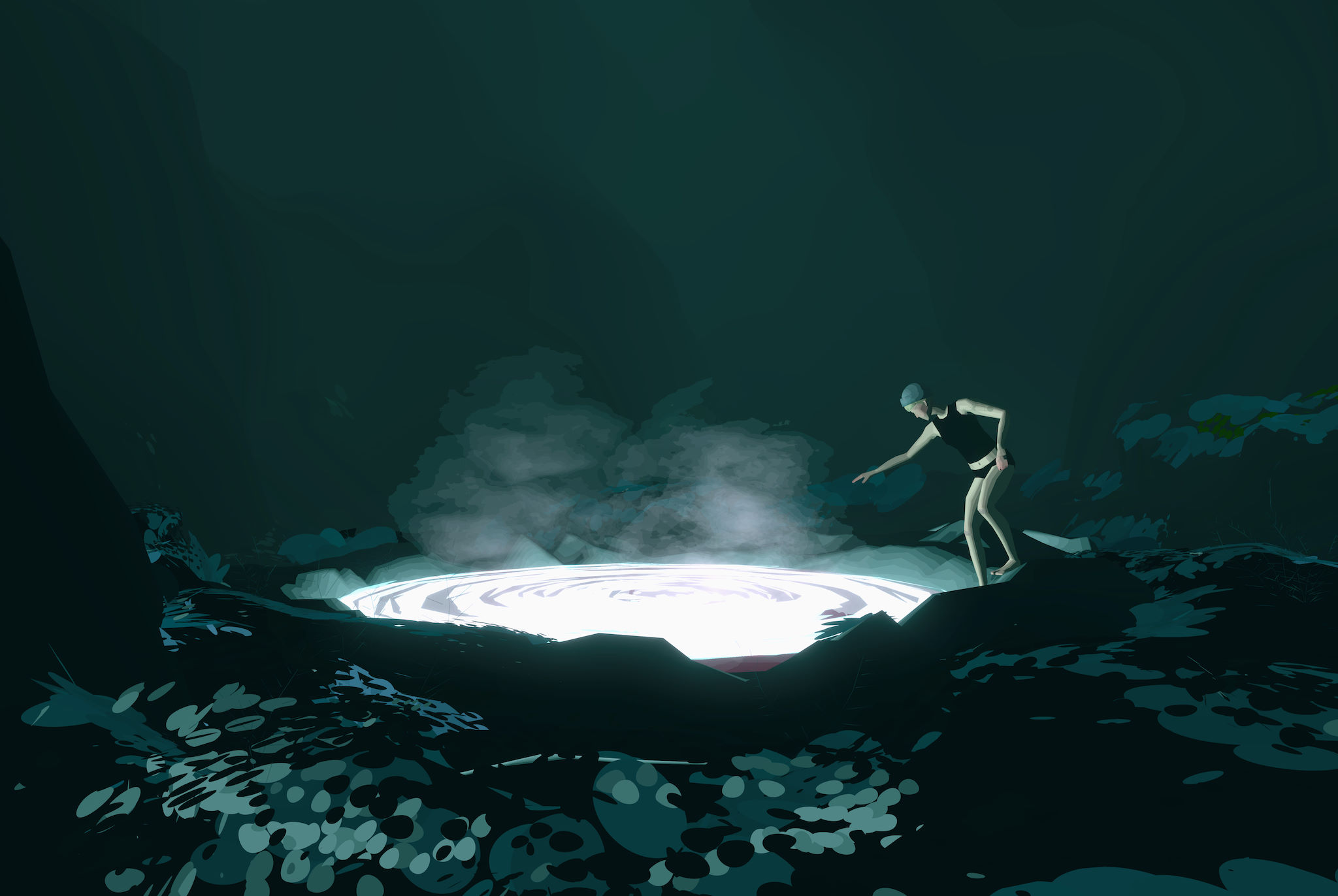 Developed using procedural modeling in Houdini. The Icelandic landscape is algorithmically "shredded" into thousands of individually colored polygons – maintaining sharp VR edges without textures, enabling precise color control, pre-baked static lighting, and vertex shader effects for wind-movement simulation in trees, water, and moss.