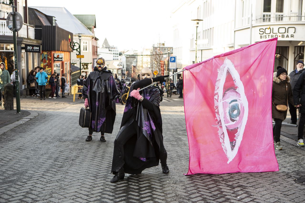 Eight masked dancers through downtown Reykjavík with hidden synchronized speakers. Custom internet radio station.