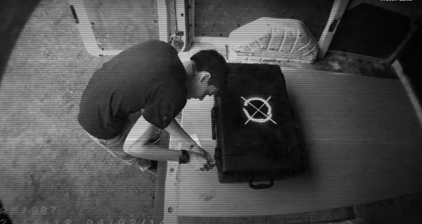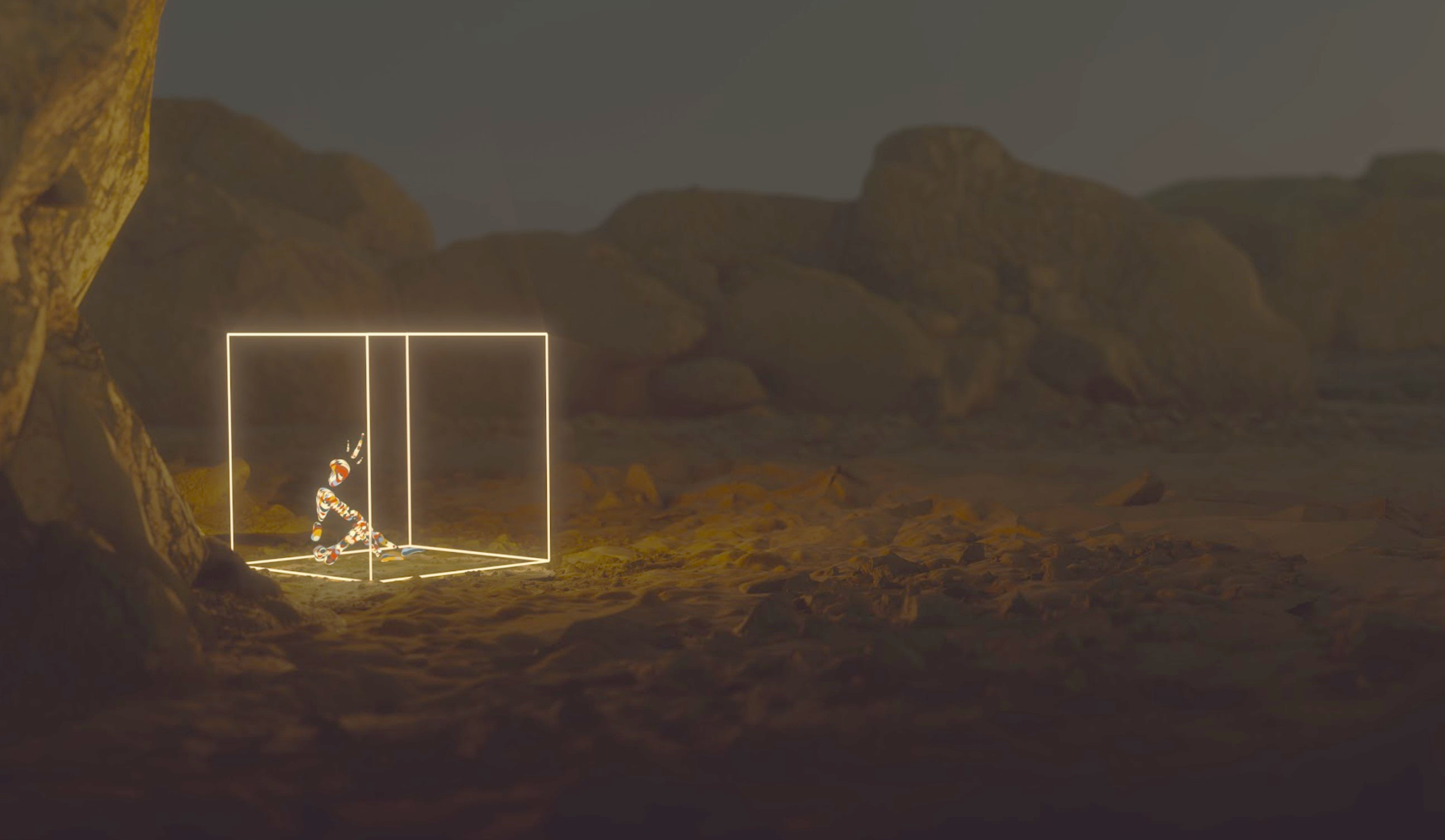 One audience member enters a VR world where they're trapped in a box in the desert. A voice pushes them to escape while a live actor tries to convince them to stay. Dual Oculus Rift with multiplayer networking.